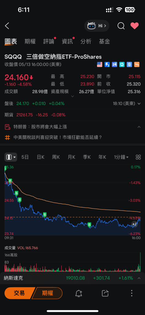 我重倉嘅 SQQQ 跌穿 US$24,帳面輸超過 HK$120,000。