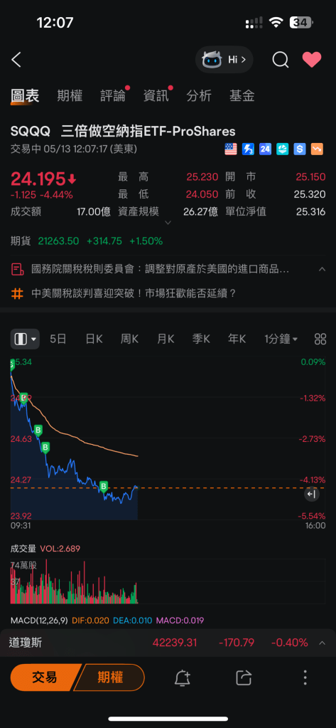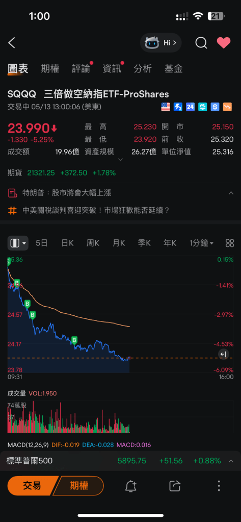 時間:2025年5月16日凌晨,SQQQ US$23.93