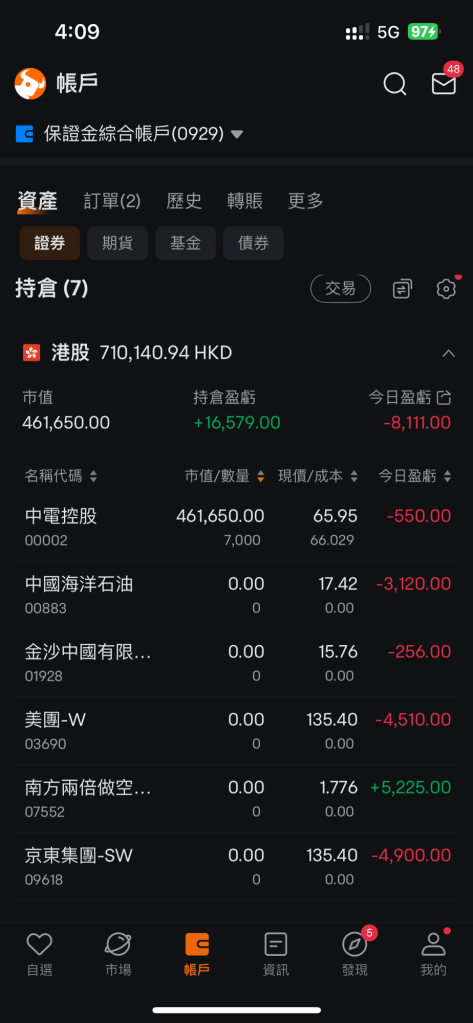 今日,港股靜極思動,我一筆清倉所有持股,換入中電控股(7,000 股,$66)。有人問:「依家換去防守股,係咪認輸?」我心諗,「唔係認輸,我係收招,重新部署。」