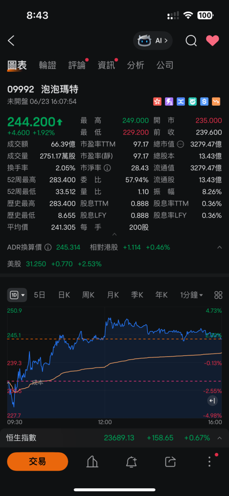 【一、9992 今日走勢:先跌 $229,再抽 $249,收市 $244】